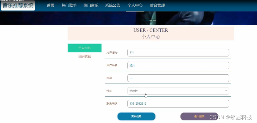 个人中心,在个人中心页面通过填写用户账号,用户姓名,密码,性别,联系电话等内容进行更新信息,还可以根据需要对我的收藏进行相对应操作,如图5-5所示。