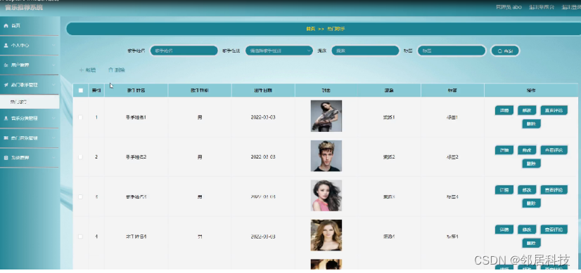 热门歌手管理;在热门歌手管理页面中可以查看索引,歌手姓名,歌手性别,出生日期,封面,流派,标签等内容,并进行详情,修改,查看评论和删除操作;如图5-9所示。