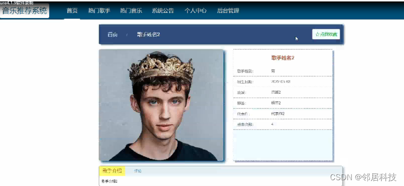 热门歌手,在热门歌手页面可以查看歌手姓名,歌手性别,出生日期,流派,标签,代表作,点击次数等内容,并可以进行评论,点我收藏等操作,如图5-3所示。