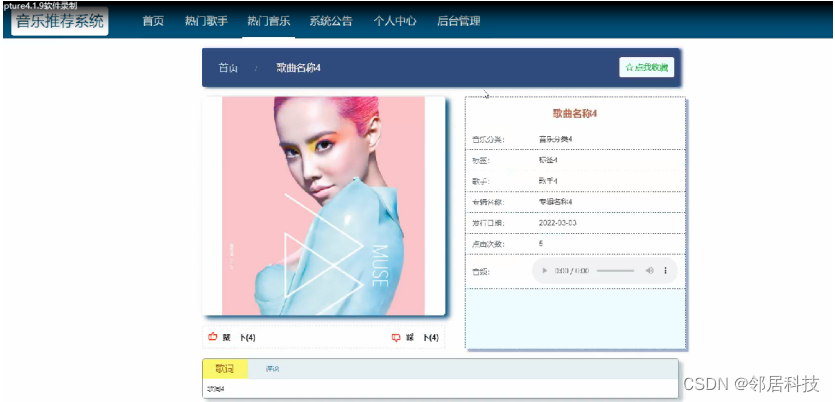 热门音乐,在热门音乐页面可以歌曲名称,音乐分类,标签,歌手,专辑名称,发布日期,点击次数,音频等内容,并进行赞一下,踩一下,点我收藏等操作;如图5-4所示。