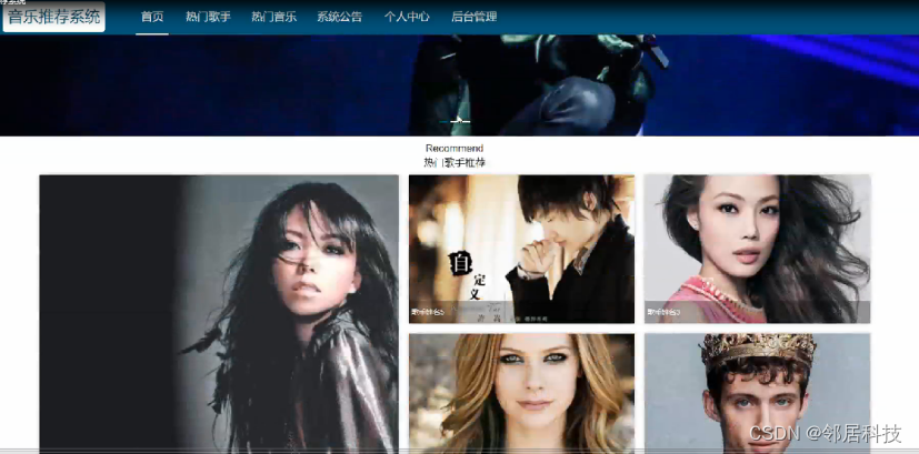 音乐推荐系统,在系统首页可以查看首页,热门歌手,热门音乐,系统公告,个人中心,后台管理等内容,并进行详细操作;如图5-1所示。