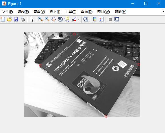 红色圆圈为鼠标点选的点,顺序为书籍左上点、右上点、左下点、右下点。图中对比可以看出,效果是一样的,不过系统的函数效率高,耗时较少。