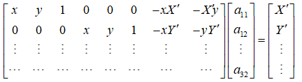 for i = 1:numscurrentPoint = moving_points(i,:);currentFixedPoint = fixed_points(i,:);coefficient_mat(2*i-1,:) = [currentPoint(1),currentPoint(2),1,...0,0,0,...-currentPoint(1)*currentFixedPoint(1),-currentFixedPoint(1)*currentPoint(2)];b(2*i-1) = currentFixedPoint(1);coefficient_mat(2*i,:) = [0,0,0,...currentPoint(1),currentPoint(2),1,...-currentPoint(1)*currentFixedPoint(2),-currentPoint(2)*currentFixedPoint(2)];b(2*i) = currentFixedPoint(2);