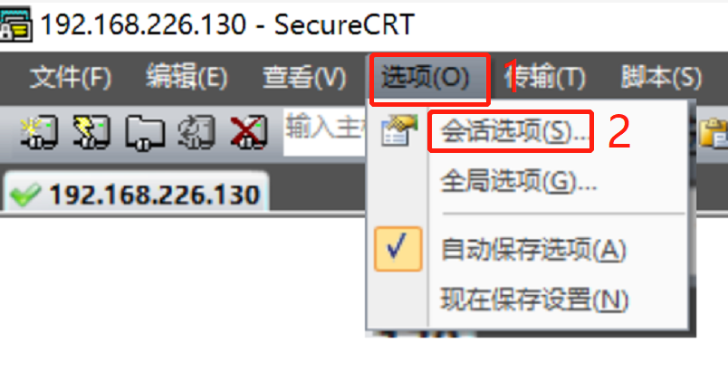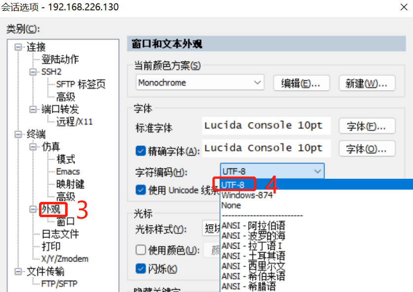 选项--会话选项--外观--字符编辑--选择UFT-8--确定【有可能需要重启一下CRT】