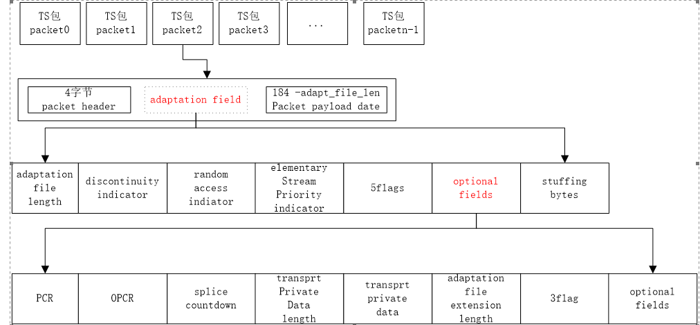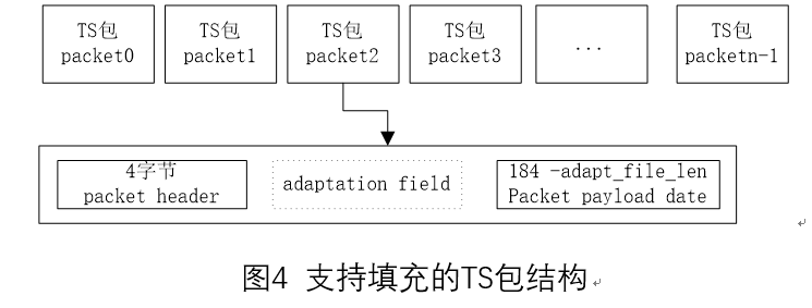 当TsPacketPayloadData中的实际有效数据不足184的时候,需要填充adaptation field数据,则按照如下格式。其中,填充规则按照4.1.2节描述。