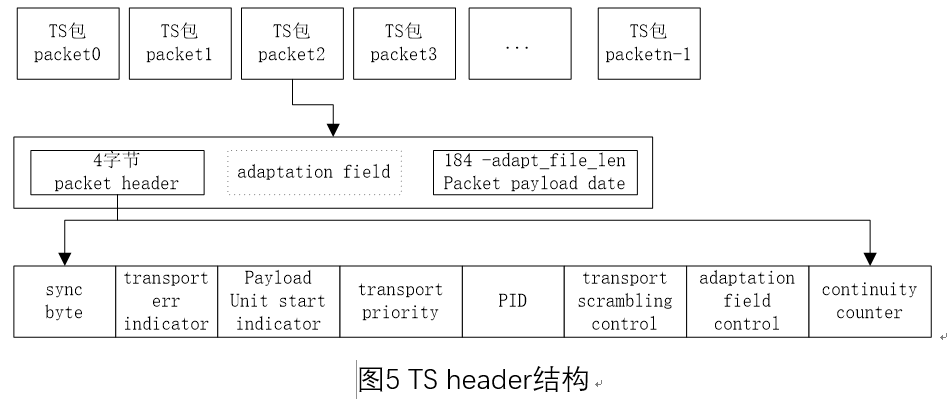 每一个TS包的内部包含4个字节的TsPacketHeader。184字节的负载数据TsPacketPayloadData。