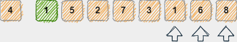 第一步从右侧开始,往左移动右指针,遇到8,6,都比4大,直到遇到1,比4小,故把1移动到最左边。右指针保持不动,开始移动左指针。