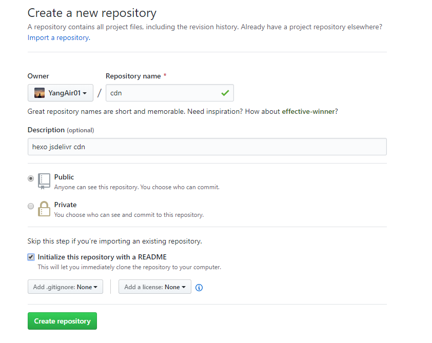 验证完成后,开始创建库,如下图所示,仓库名创建格式必须为:<用户名>.github.io,Description为描述仓库,自定义写,填写必要的描述,也可不填。勾选Initialize this repository with a README点击Creat repository进行创建。