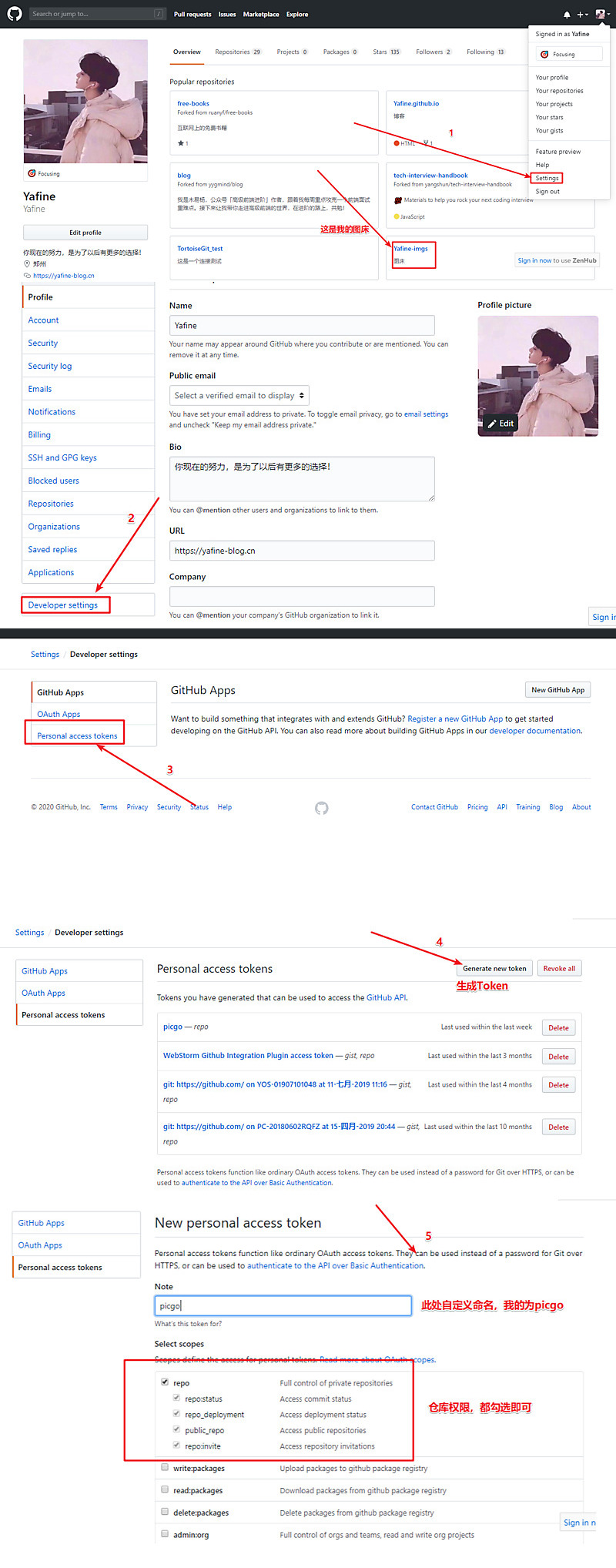 - 设定仓库名:这个是刚刚第一步所新建仓库的名称,我的为Yafine-imgs,此处填写格式username/repo。