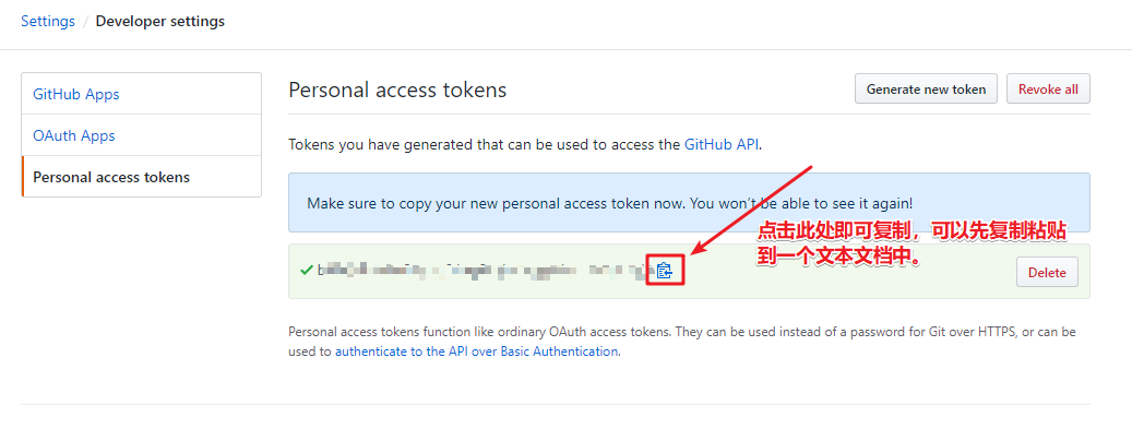 最后点击Generate token即可看到显示的token页面,它只会显示一次,关闭页面后再打开这个页面就不会显示了。复制token值粘贴到文本文档中,先保存下来,后面配置PicGo要用到。