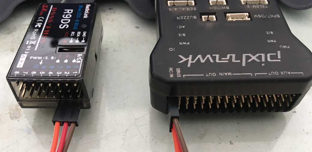 两根PWM控制线一端连接收机,另一端连云台的控制板。控制板上有两排插针,上面一排不用管,下面一排是信号输入,从左往右数第二个插针控制俯仰,第四个插针控制横滚。遥控器上的两个旋钮分别是第6通道和第8通道,所以pwm控制线从云台下面一排的第2根针和第4根针接出,连到接收机的第6通道和第8通道的信号极(通道序号要看sbus的序号,是用蓝色字标出的)。