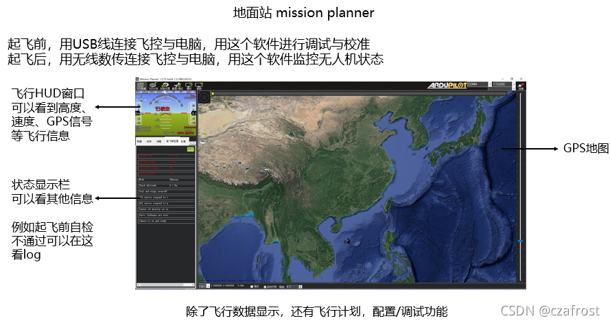 地面站是地面端用来显示飞控传回的数据的软件,起飞前可以对飞机进行调试,起飞后可以监控飞机的状态,还具有制定航线等功能。飞控和地面站的连接方式有两种,有线/无线。其中有线连接就是拿micro usb线接上飞控,另一头usb接到电脑,在第一次做调试的时候只能这样连接。而无线连接就需要依靠数传电台,起飞以后通过无线数传将飞控数据传到地面设备。