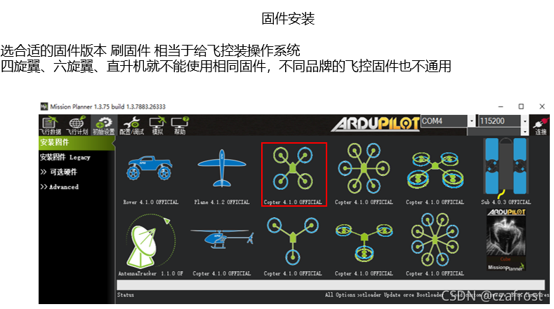 用usb线连接PC和飞控,在mission planner右上角选择对应的COM口,选择波特率115200,连接。连接成功以后刷固件。初始设置->安装固件->选择四旋翼的对应图案->按照指示操作。中间会弹窗问你几个问题,百度一下,不要随意选yes。