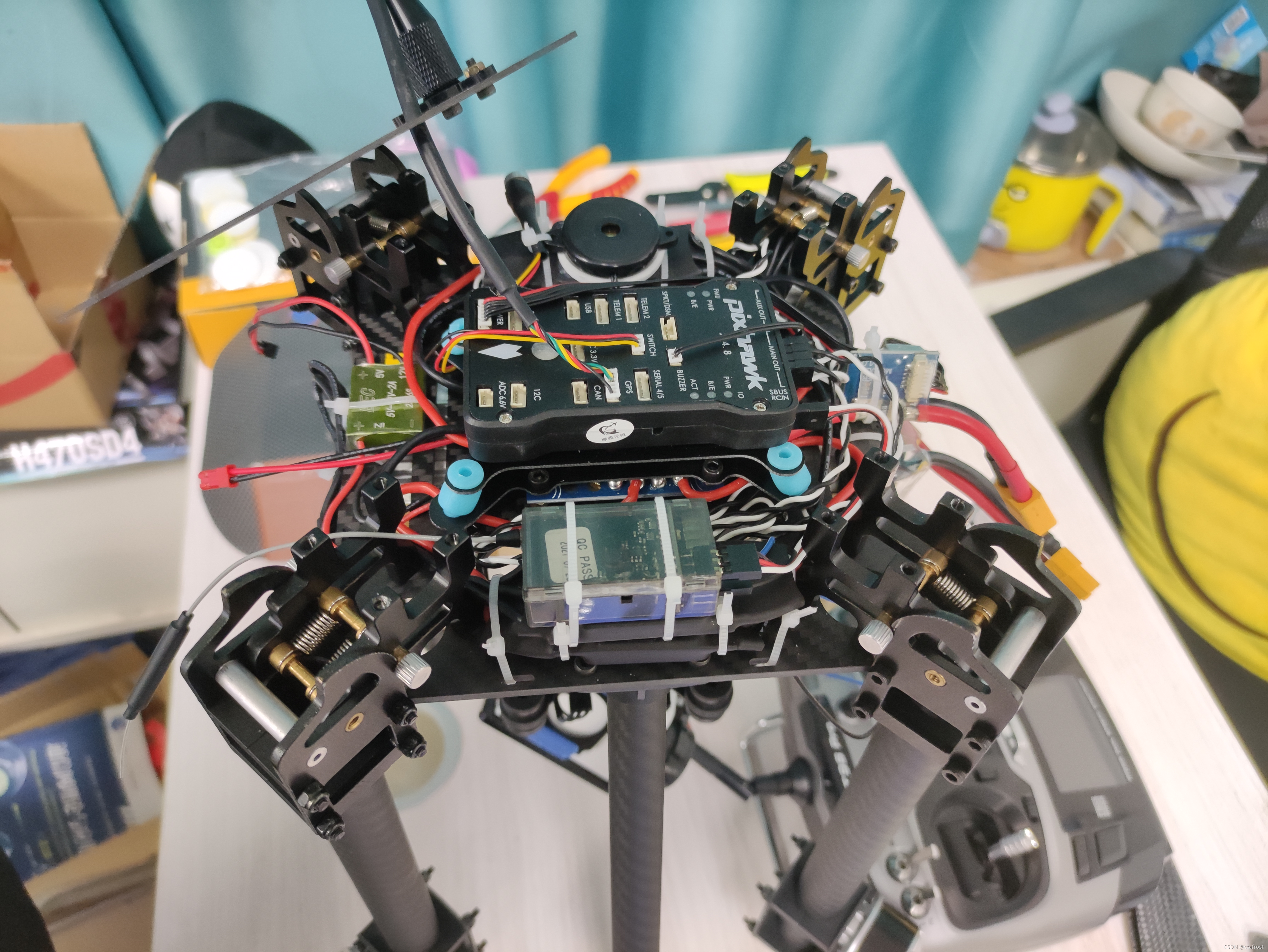 先把飞控和减震板固定起来,用两个圆形粘胶就可以。然后把飞控+减震板固定到飞机上,这里还是用粘胶,用两层粘胶,一面粘在分电板中心空出来的位置上,一面粘在减震版底下。这里需要整理一下分电板上的线,尽量让它们靠边些,留出中间一个圆形的区域放粘胶。粘好以后把机架的上层板盖上试一下,飞控的上表面到上层板之间应该还有一点距离,距离不够的话必须要调整一下,留出几个毫米,因为飞控插上各种连接线以后还会变高一点。