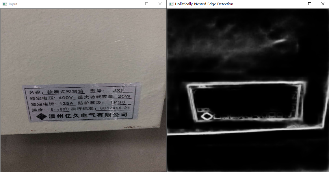{cv::Mat src = cv::imread("1.jpg");cv::namedWindow("原图", 0);cv::imshow("原图", src);resize(src, src, cv::Size(500, 500));cv::Mat dst;edgeDetection(src, dst, 2.2);cv::namedWindow("HED", 0);cv::imshow("HED", dst);cv::waitKey(0);return 0;