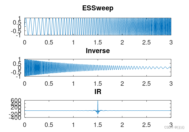 if __name__ == "__main__":# Sweep Parametersf1 = 10f2 = 100T = 3fs = 1000t = np.arange(0, T*fs)/fsR = np.log(f2/f1)# ESS generationx = np.sin((2*np.pi*f1*T/R)*(np.exp(t*R/T)-1))# Inverse filterk = np.exp(t*R/T)f = x[::-1]/k# Impulse responseir = sig.fftconvolve(x, f, mode='same')# Get spectra of all signalsfreq, Xdb = dbfft(x, fs)freq, Fdb = dbfft(f, fs)freq, IRdb = dbfft(ir, fs)plt.figure()plt.subplot(3,1,1)plt.grid()plt.plot(t, x)plt.title('ESS')plt.subplot(3,1,2)plt.grid()plt.plot(t, f)plt.title('Inverse filter')plt.subplot(3,1,3)plt.grid()plt.plot(t, ir)plt.title('Impulse response')plt.show()