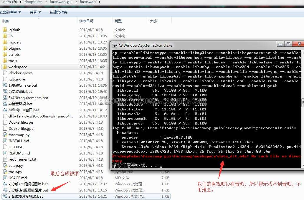 到这里,我们的视频就合成完成了,合成视频在workspace文件夹里,因为源文件是没有音频,所以这里也没有音频。如果源视频有音频,会输出ResultWithAudio.avi。