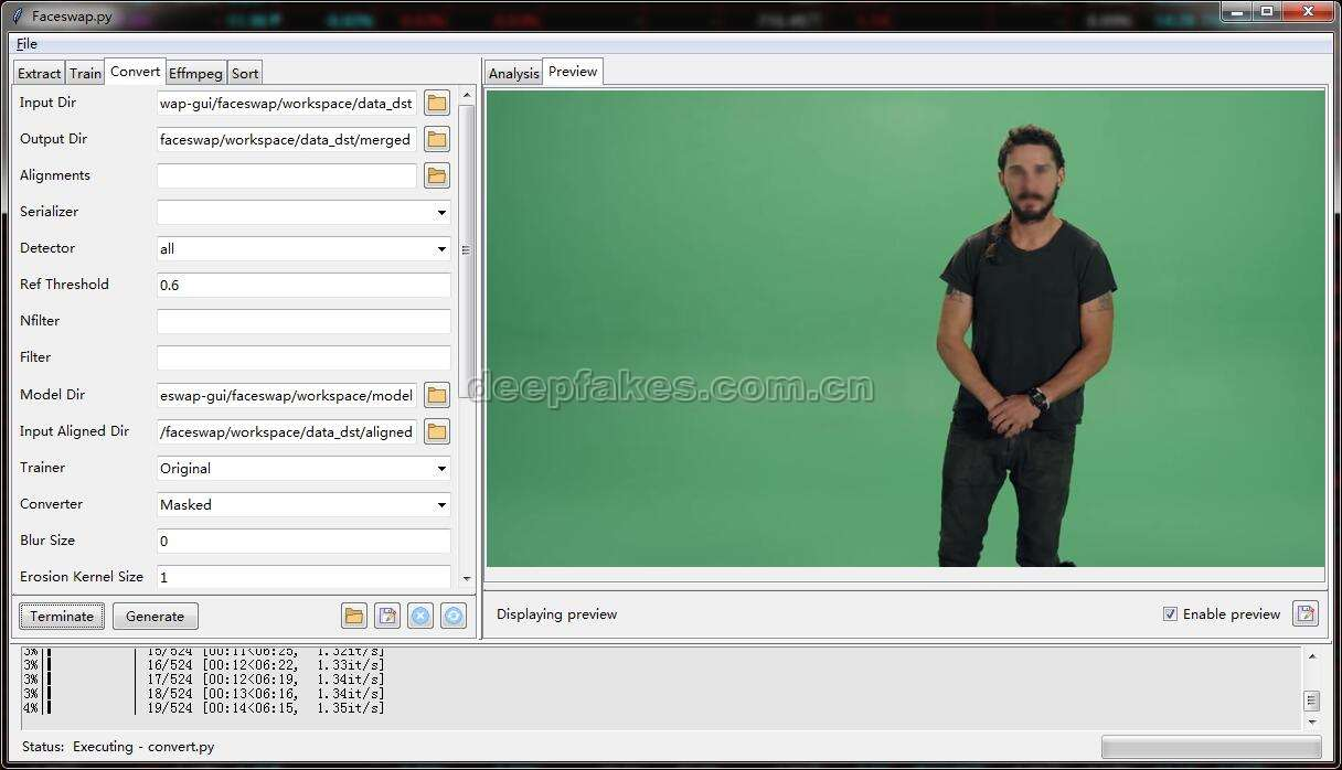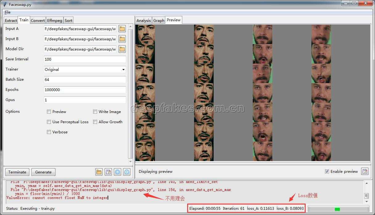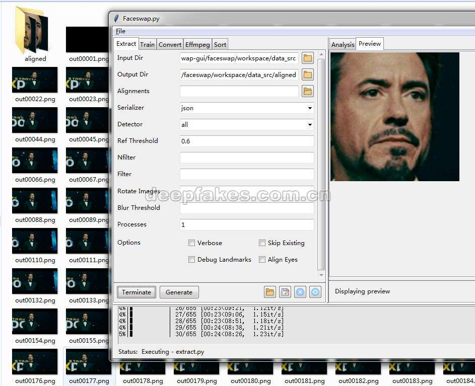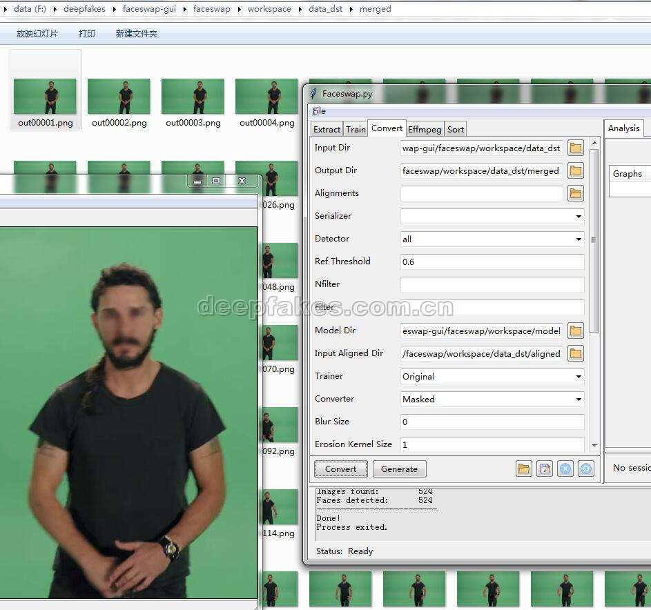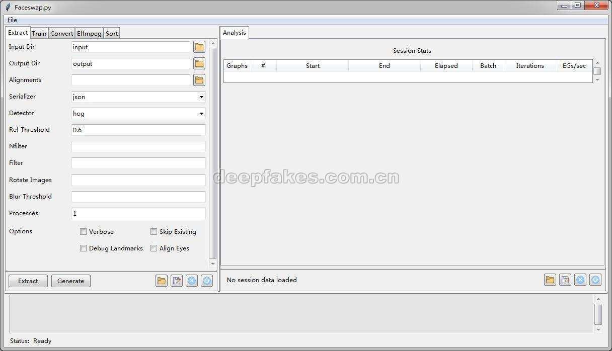 左上角5个标签,分别是Extract – 提取头像,Train – 训练, Convert – 转换,后面的effmpeg和sort有bug,我们暂时不用。