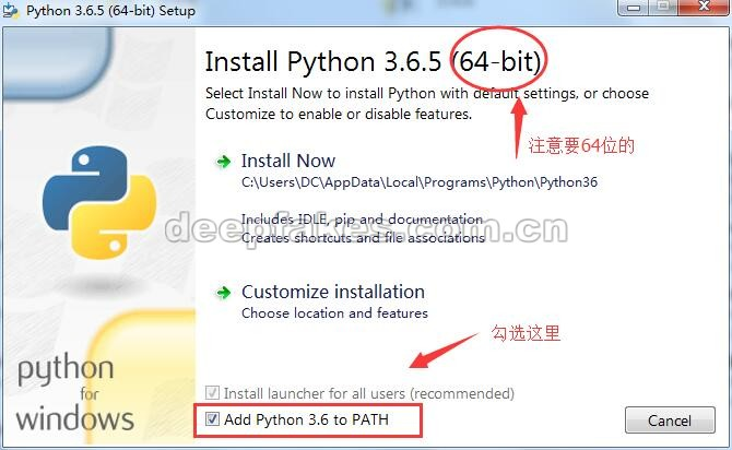 地址:https://www.python.org/ftp/python/3.6.5/python-3.6.5-amd64.exe勾选Add Python 3.6 to PATH