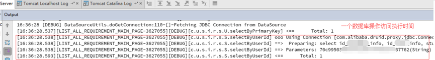 对于SQL的优化,主要是针对SQL语句处理逻辑的优化,而且还要根据索引进行配合使用。另外,对于SQL语句的优化我们可以针对具体的业务方法进行优化,我们可以将执行业务逻辑操作的数据库执行时间记录下来,来进行有针对性的优化,这样的话效果还是很不错的!例如下图,展示了一条数据库操作执行调用的时间: