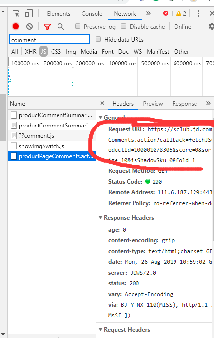 3)搜索comment,选择JS,点击productPageComments...,点开里面显示的就是商品评论的URL;