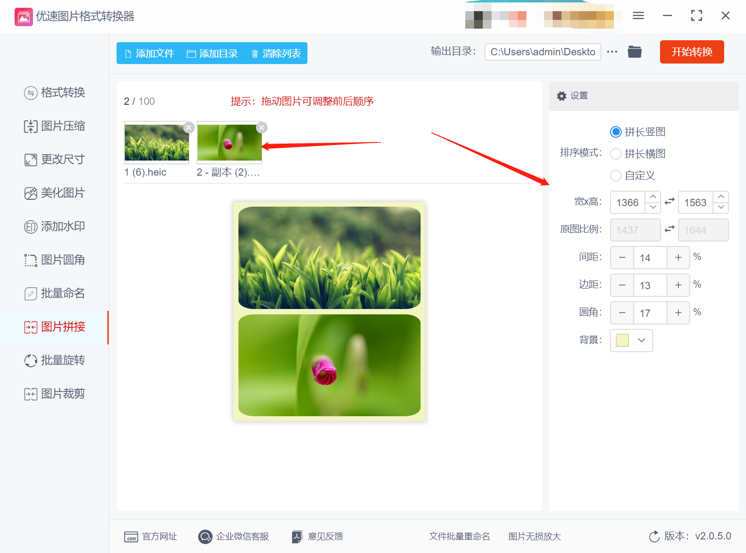 第三步,添加好之后,我们在页面可以看到照片的缩略展示。直接拖动照片 就能调整照片拼合的顺序。照片拼合的设置在软件右侧进行,首先选择合并的排序方式(拼成长竖图/长横图)。然后设置合并后的其他参数:宽度、高度、间距、边距等。在设置的同时,我们可以在界面看到调整的效果。