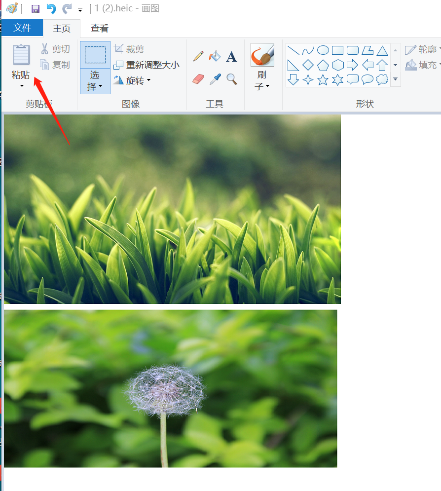第一步,用画图工具打开我们其中一张待合成的图片,然后在你想要合并的位置点击“粘贴”,这时将另一张图片导入到工具中。