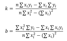 {int64 sum_x = 0;int64 sum_y = 0;int64 sum_x_x = 0;int64 sum_x_y = 0;for (int i = 0; i < n; i++, pt++){sum_x += pt->x;sum_y += pt->y;sum_x_x += (int)pt->x * (int)pt->x;sum_x_y += (int)pt->x * (int)pt->y;}int64 tmp = n * sum_x_x - sum_x * sum_x;if (tmp == 0) tmp++; k = (int)((n * sum_x_y - sum_x * sum_y) * 65536 / tmp);b = (int)((sum_x_x * sum_y - sum_x_y * sum_x) * 65536 / tmp);return 1;