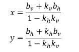 {int64 tmp = 0x100000000LL - kh * kv;pt->x = (int16)(((int64)bv * 65536 + (int64)kv * bh) * 16 / tmp);pt->y = (int16)(((int64)bh * 65536 + (int64)kh * bv) * 16 / tmp);return 1;
