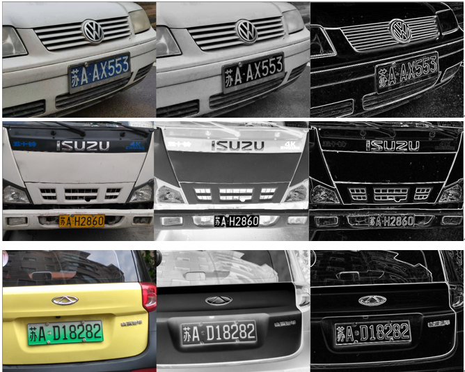 为了便于搜索车牌边界Edge,不同类型车牌的图像,无论原来是白字还是黑字,都要变换为车牌背景暗、字亮的灰度图像。如下图每行中间和最右的图像,都满足这样的条件。Edge搜索算法基于背景暗、字亮的前提条件。