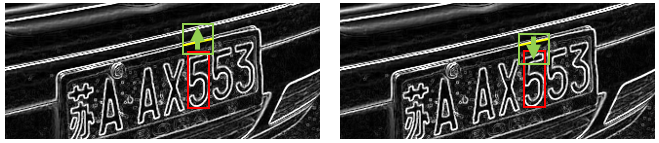 以从给定范围(某字符bound)向上搜索车牌边界为例。上图左边示意从里向外(自下而上),右边示意从外向里(自上而下)。红色框示意给定bound,绿色框示意搜索范围。搜索范围的宽度(x方向)为bound宽度的9/8,深度为bound高度的1/2。搜索的起点则有差别,从里向外的情形中位于bound上缘附近,从外向里的情形中位于bound上缘往上1/4高度。从左向右按列进行搜索。每一列搜索时先跳过前景色(亮),再跳过背景色(暗),到达新的前景色(亮)则认为找到了车牌边界(图中黄色部分)。代码如下: