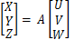 设一个点在真实世界中的坐标为(U, V, W),摄像投影后的坐标为(X, Y, Z),透视变换矩阵为A,则透视变换的数学表达式为