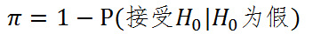 显然,我们希望这个概率越小越好,因为这个概率越小,我们的检验能力越厉害。我们用「检验的功效」来刻画我们检验的厉害程度,用来表示:
