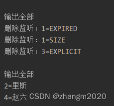 public static void main(String[] args) {LoadingCache<Integer, String> cache = CacheBuilder.newBuilder()//缓存存储最大数量.maximumSize(3)//访问过期时间3s.expireAfterAccess(3, TimeUnit.SECONDS)//监听删除.removalListener(notification -> System.out.println("删除监听:" + notification.getKey() + "=" + notification.getCause())).build(new CacheLoader<Integer, String>() {@Overridepublic String load(Integer key) throws Exception {//当缓存不存在时能够自动加载数据到缓存中return TEST_DATA_MAP.get(key);}});try {cache.get(1);Thread.sleep(3000);printAll(cache);cache.get(1);cache.get(2);cache.get(3);cache.get(4);cache.invalidate(3);printAll(cache);} catch (Exception e) {e.printStackTrace();}