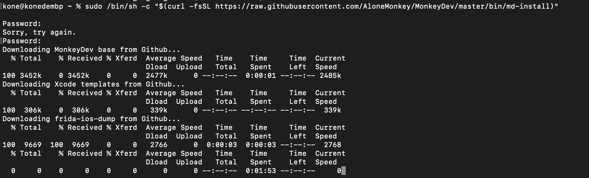 sudo /bin/sh -c "$(curl -fsSL https://raw.githubusercontent.com/AloneMonkey/MonkeyDev/master/bin/md-install)"