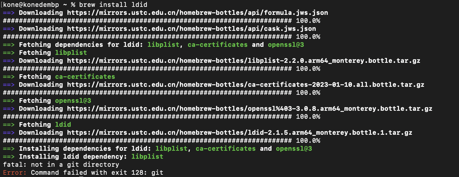 执行brew install ldid报错Command failed with exit 128:git 原因是安装homebrew时缺少两个包