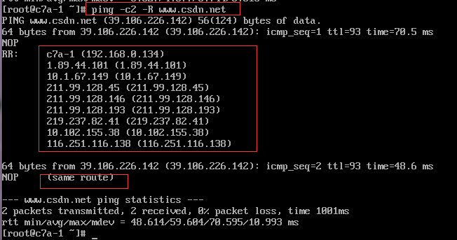 如图,ping结果显示了路由信息。第二次发包因为路由信息一致,没有列出,只是简单说same route。