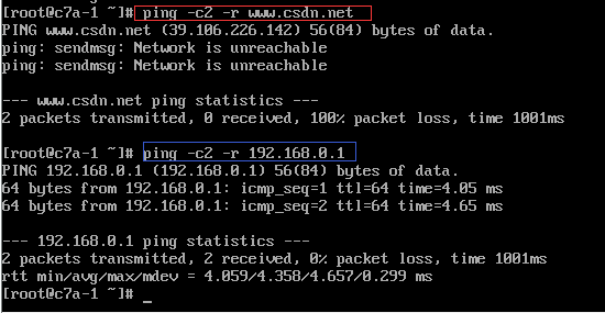在-r参数作用下,本地网关是可直接访问的,因此成功返回包。而www.csdn.net需要通过路由转发,忽略路由无法送达。
