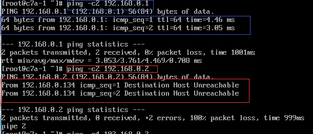 例子1:对网关和一个不存在的主机地址执行ping -c2
