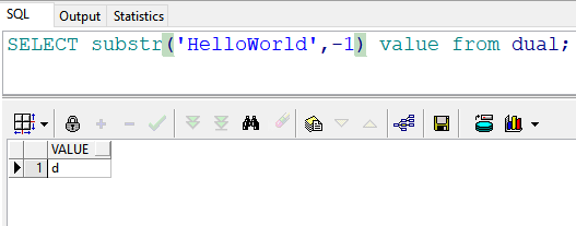 15、select substr('HelloWorld',-1) value from dual; //返回结果:d,从最后一个“d”开始 往回截取1个字符