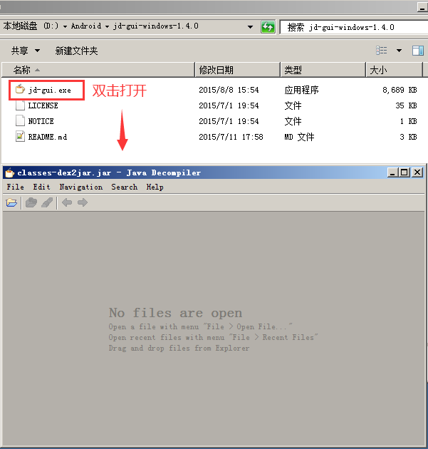 1、打开jd-gui-windows-1.4.0目录,双击打开jd-gui.exe程序,如下图: