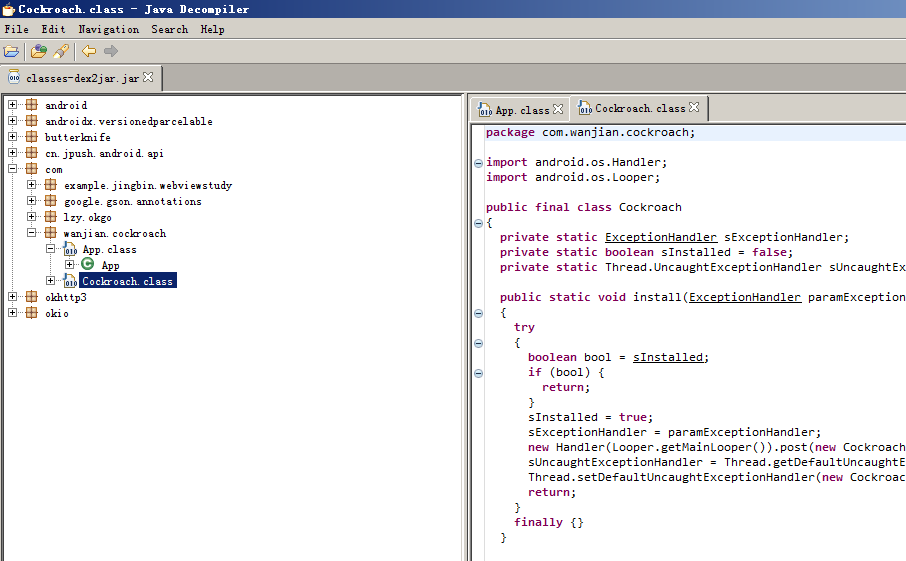 2、把刚才生成的classes-dex2jar.jar文件直接拖到jd-gui窗口里,然后就可以查看java源代码了,如下图: