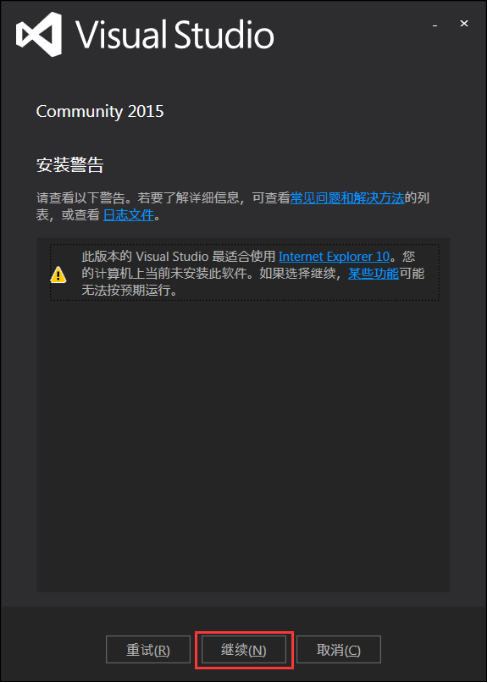 单击 “安装” 按钮,按照提示依次单击 “继续” 按钮即可完成 Visual Studio 2015 的安装操作。