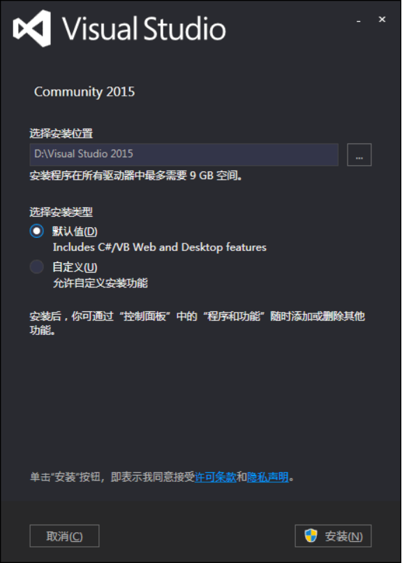 此外,在该界面中可以选择 “默认值” 或 “自定义”, 本教程在安装时选择的是“默认值”,默认安装是将 Visual Studio 2015 中的主要功能全部安装。