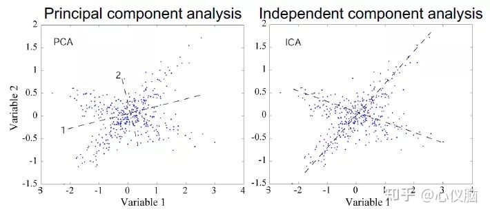 主成分分析假设源信号间彼此非相关,独立成分分析假设源信号间彼此独立。
