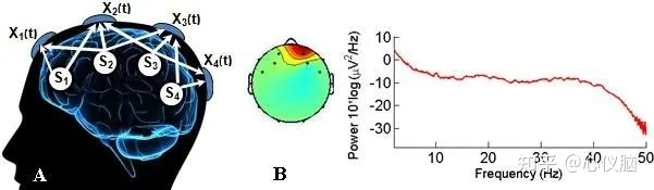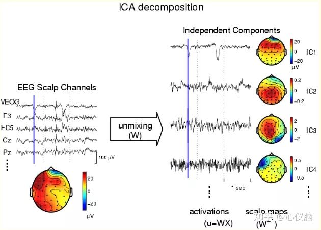 相反,ICA则试图将通道活动分成尽可能多的独立成分。独立的EEG成分通常是一个皮质区域内的准同步活动,或者是胼胝体连接的两个皮质区域内的活动,或者是伪迹源——眼动、肌电、心电、线噪、电极噪声等。因此,ICA对于将EEG数据分割成最简单的生理成分是非常有效的(注意,单独的头皮通道记录不是单独的生理成分,因为脑电不是由电极产生的)。