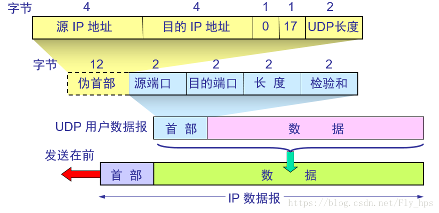 - 在计算检验和时,临时把“伪首部”和UDP 用户数据报连接在一起。伪首部仅仅是为了计算检验和。