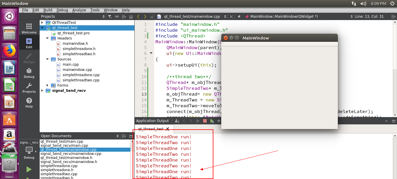 {QApplication a(argc, argv);MainWindow w;w.show();SimpleThreadOne *SThread = new SimpleThreadOne();SThread->start();return a.exec();