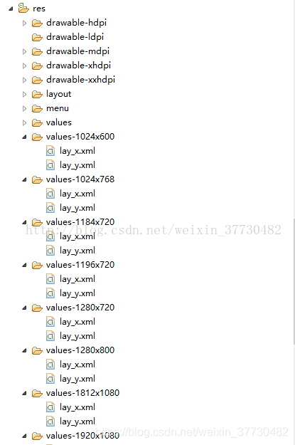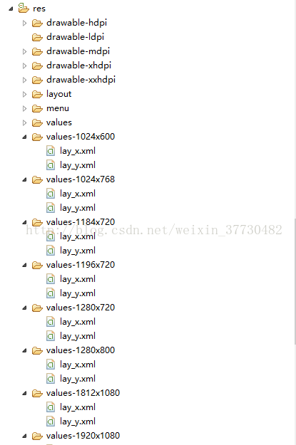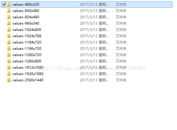 即在res/文件夹下建立不同的values文件夹(高X宽(大数在前))不同的values文件夹下有相同的dimens.xml文件。相同的dimens.xml文件中有相同的名称