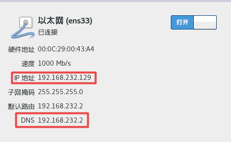 注意,配置是根据之前安装Linux时生成的以太网配置修改的,这里将IP地址改成了 192.168.232.129